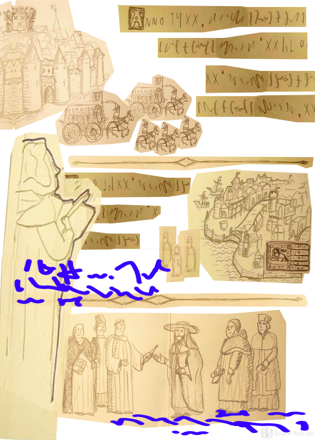 Early pencil sketches based on medieval illustrations