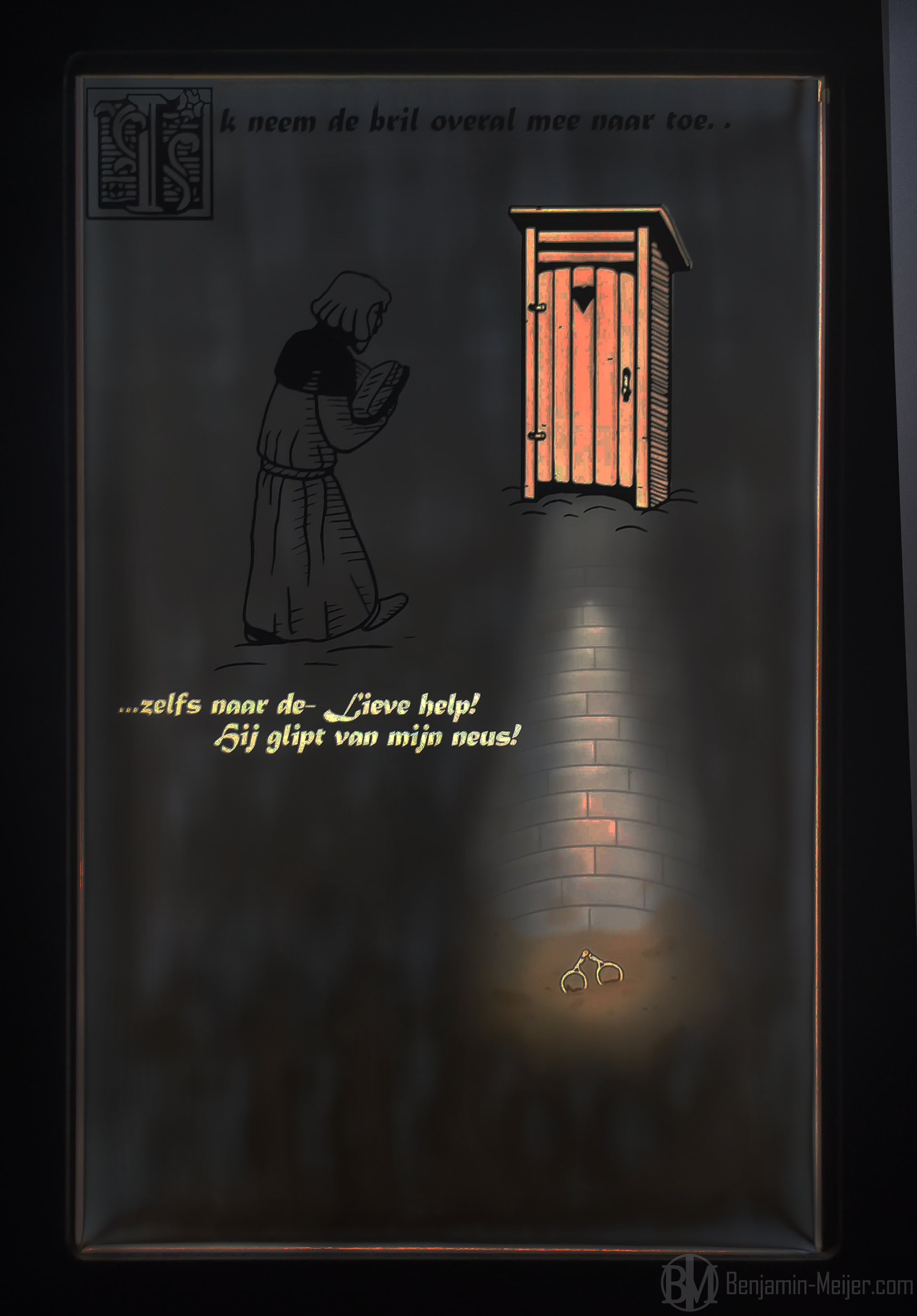 "Voor Wie het Zien wil" tells the story of the fictional, but theoretically plausible history of the oldest complete pair of glasses ever found in the Netherlands. The project follows the museum's "secrets" theme introduced during the tapestry project, and gives viewers a look into the secret shameful thoughts of a clergyman, by having the viewer literally look through a pair of these historical glasses to see the story's hidden core.